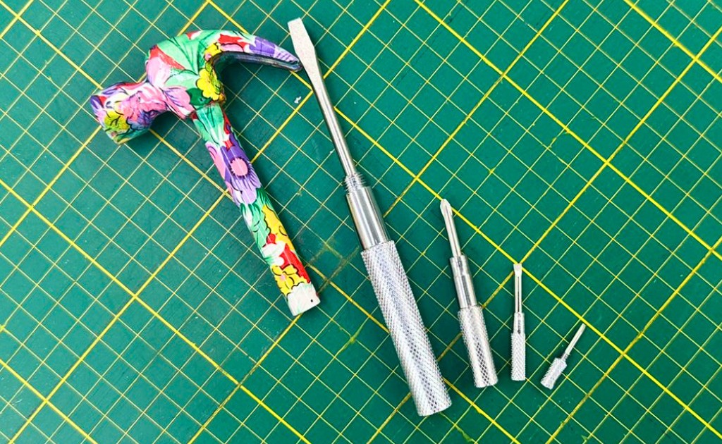 Esse martelinho facilita a vida no ateliê e serve para várias funções. Além do martelo, ele vem com 4 chaves que servem para diversas tarefas como apertar calcador, soltar parafusos, tirar o calcador da máquina e muito mais!